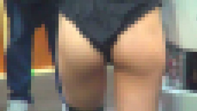 お尻が食い込んだ白い短パンを着用しています。