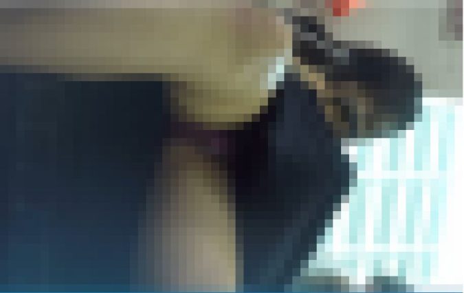 近づいてスカート内を確認すると紫の生パンティーの様でした。制服に生パンツの組み合わせはエロいですね。