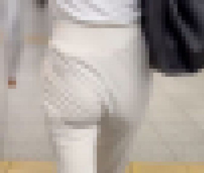 高身長で美脚が強調された白色のストレッチパンツ。